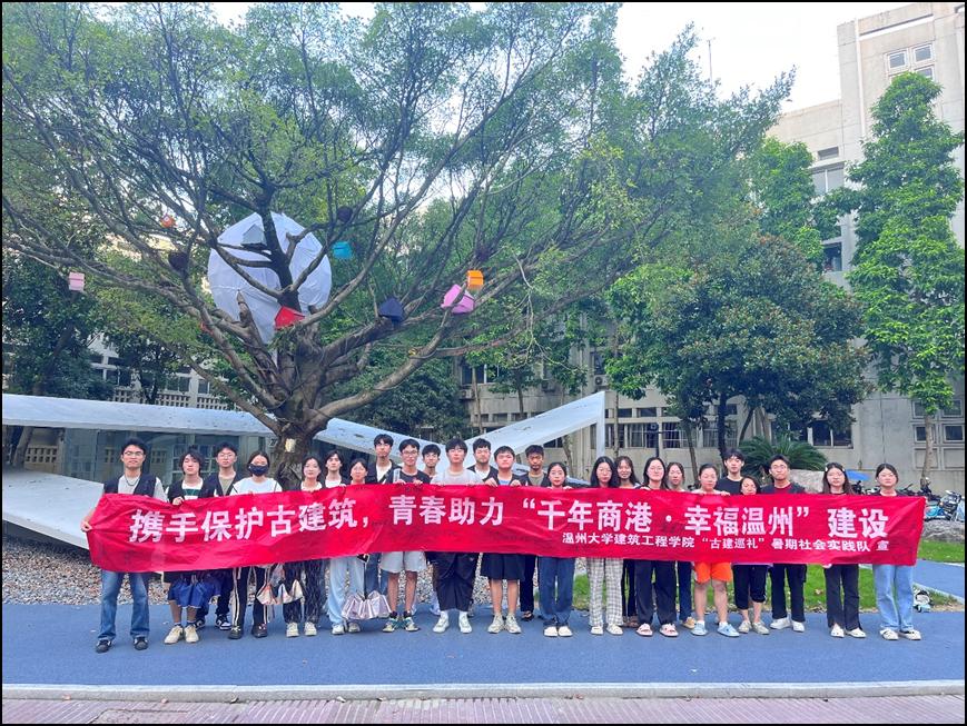 古建巡礼实践队是一支探访古建筑、致力美丽乡村建设的队伍。8年来,这支队伍走过永嘉楠溪江畔的古建筑群,泰顺泗溪的古廊桥,苍南的矾山古镇;去过瓯海的梧田老街,瑞安曹村东岙文化礼堂,文成二源乡田驮村;也到访过瓯海的三垟湿地、山根村之一例。队员们在当地开展建筑测绘、建筑写生、模型制作、文创产品设计以及其他相关保护研究工作,为城市乃至国家的繁荣昌盛贡献着青春力量。
