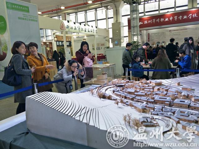 温大书房、温大科创、温大科普、温大文化、温大教技等五大展区向人们展示着温大扎根地方、服务地方的坚定信念。其中最吸引游人注意的要数温大从福建“搬”来的土楼。作为福建民居中的瑰宝,土楼因其独特的造型闻名于世。温大建筑系48名学生通过实地测绘、画图、制作模型等方式,将福建塔下村的14座土楼与1座宗祠按照1:200的比例“搬”到了文博会现场展出。