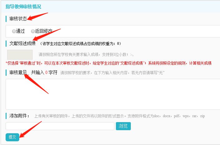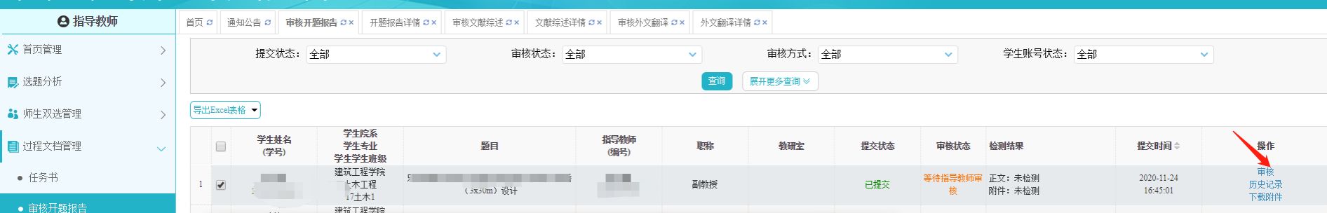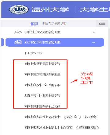 2、指导教师在“毕业设计(论文)网络平台(知网版)”(链接网址//wzu.co.cnki.net/或通过教务处主页点击登录),在“过程文档管理“中,点击完成“审核开题报告”、“审核文献综述”、“审核外文翻译”、“填写中期报告”和“审核指导记录”五项工作。操作步骤示例如下: