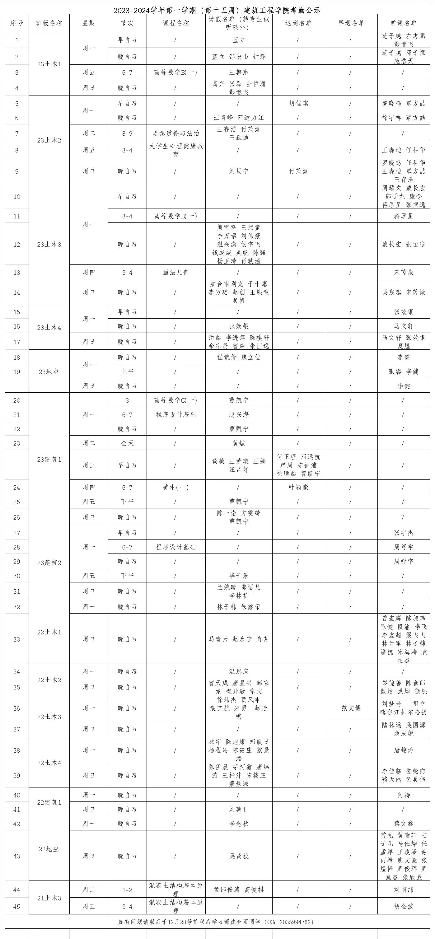 2023-2024学年第一学期(第十五周)日本无码 考勤公示
