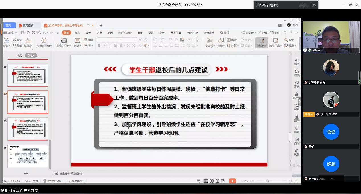 首先,刘良友老师从两码一表、返校须知、学生干部的职责等多个方面对返校复学工作做了总体部署,重点就学生返校过程中的注意事项进行了详细的讲解,并对学生干部在返校后的工作提出了几点建议,同时指出返校后应加强班级学风建设以及对同学们的心理疏导和人文关怀、尤其是关于班级网格化管理:责任到人,加强组织管理能力,提高工作效率。