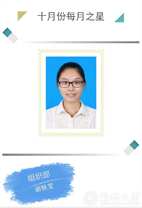 是组织部的新干事。在进入组织部的一个月里,她认真仔细,圆满完成了学生会交给她的每项任务,获得了部长及其他干事的好评。在为团学建设添砖加瓦的同时,她也锻炼了自己的能力,充实了自己的大学生活,从一个懵懂不自信的大一新生,变成了一个遇到事情沉着镇静的合格干事。她感谢组织部给她以机会得到历练,组织部也感谢她对待工作的一丝不苟