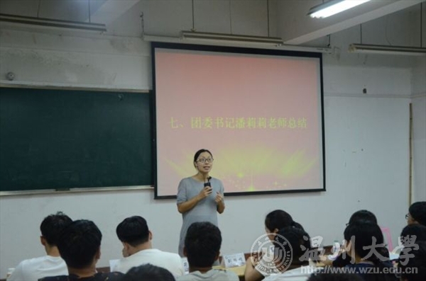 退休干部辞劝退条例(草案)》,该文件得到了大家的一致认同,并在热烈的掌声中被通过试用。接着辅导员助理刘明媚与副主席虞林臻分别对新干事的学习、工作和生活方面致词,表达了对于会议成员大学生活的美好期望,希望每个人都能珍惜大学生活,并为自己的目标努力奋斗。会议最后由团委书记潘莉莉老师做总结,她用热情、用心、尝试三个词表达了对团学成员的期望,潘老师还结合自己的个人经验来为大家的大学生生活作出指引。会议后,各部门新干事踊跃的进行了自我介绍,大家庭氛围愈发浓烈。