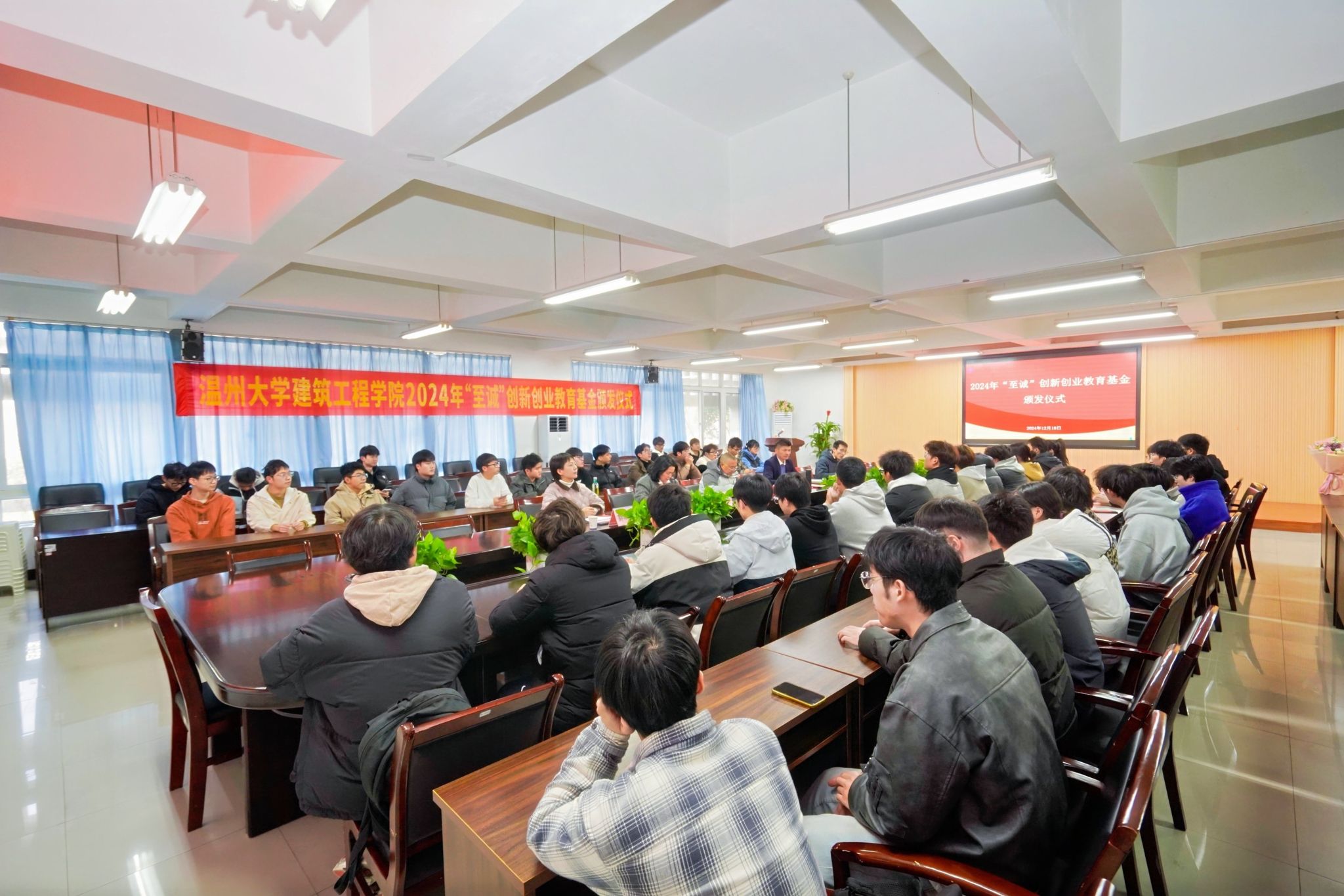 在7A201会议室举行2024年“至诚”创新创业教育基金颁发仪式,浙江至诚建设有限公司董事长、97级校友陈建德及其爱人董春华、院党委书记王壮、学院党委副书记陈铎等出席。仪式由院党委副书记陈铎主持。